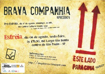 A CIA Teatral A Brava em parceria com o Ponto de Cultura da Comunidade Cidadã apresenta seu novo trabalho "Este lado para Cima" no Calçadão Cultural do Grajaú no dia 22/08 a partir das 17h30 para a população local e para os participantes das atividades do Ponto Da Comunidade.